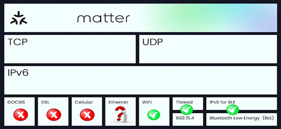 Matter này sử dụng trên IP6 và trong thông số kỹ thuật V1 ,có thể chạy trên Ethernet, WiFi doặc ThRead .. và đây là lúc Thread xuất hiện . Thread chạy trên cùng một đài được Zigbee sử dụng , nhưng sử dụng IPv6 thay vì giao thức mạng riêng và không đi vào lớp ứng dụng, giống như Zigbee.